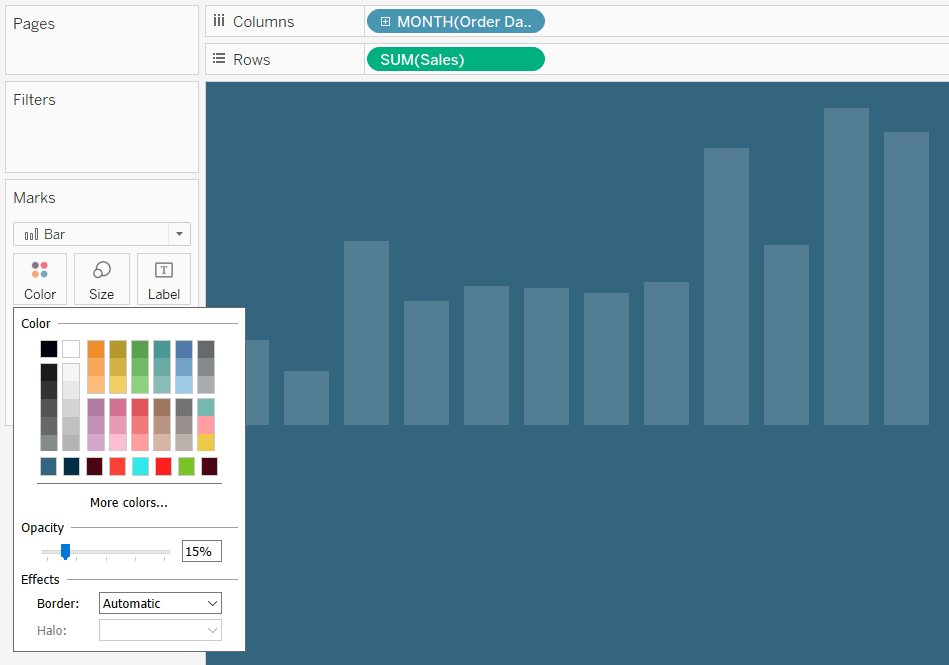 Since this will eventually be behind the Sales callout number, I’ll make the bars just 15% opaque by clicking on the Color Marks Card and dragging the opacity slider to the left: