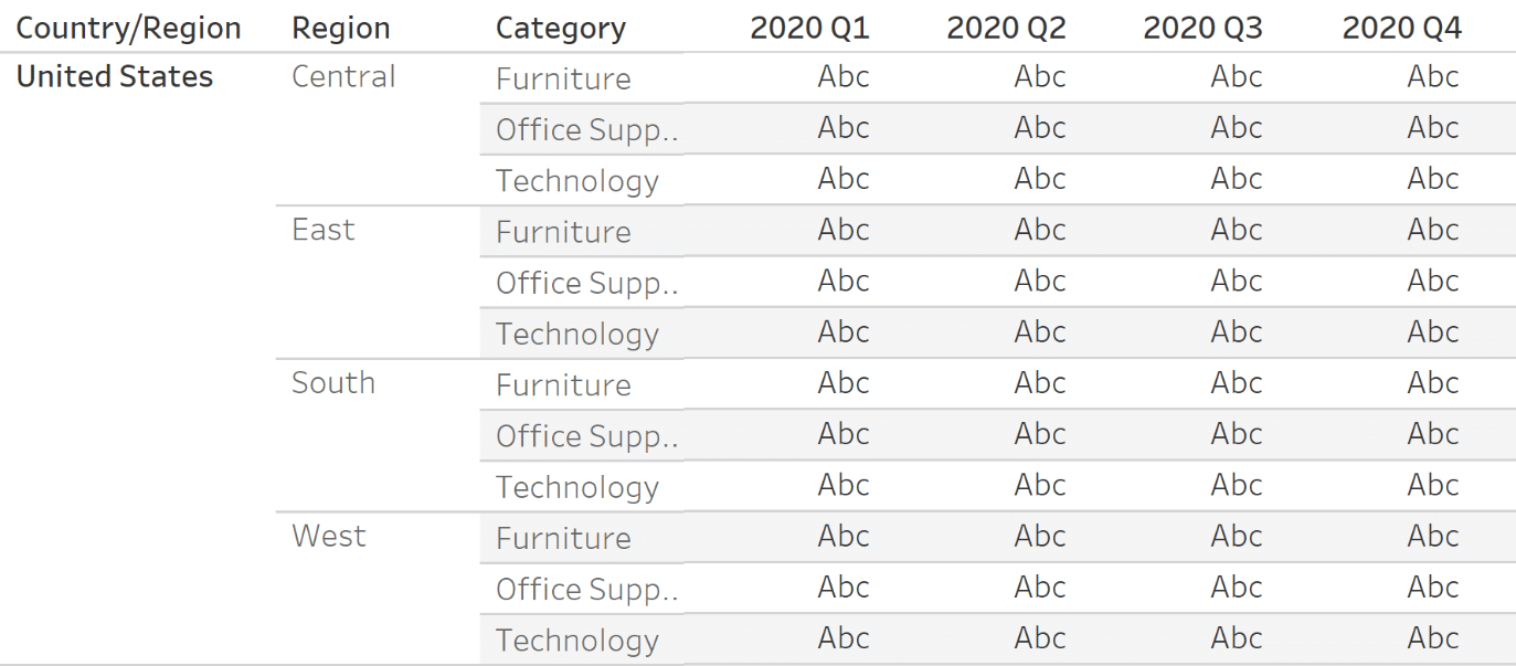 To upgrade this crosstab to one that makes the sales goal aspect apparent, we’ll start with a very similar setup. Connect to the Sample Superstore dataset in Tableau. Add Country/Region, Region, and Category to the Rows shelf. Add quarter of Order Date onto the Columns shelf, and make sure it’s set to Discrete. This shifts the column labels to the top of the table and makes it easier to read. You should have a view like this: