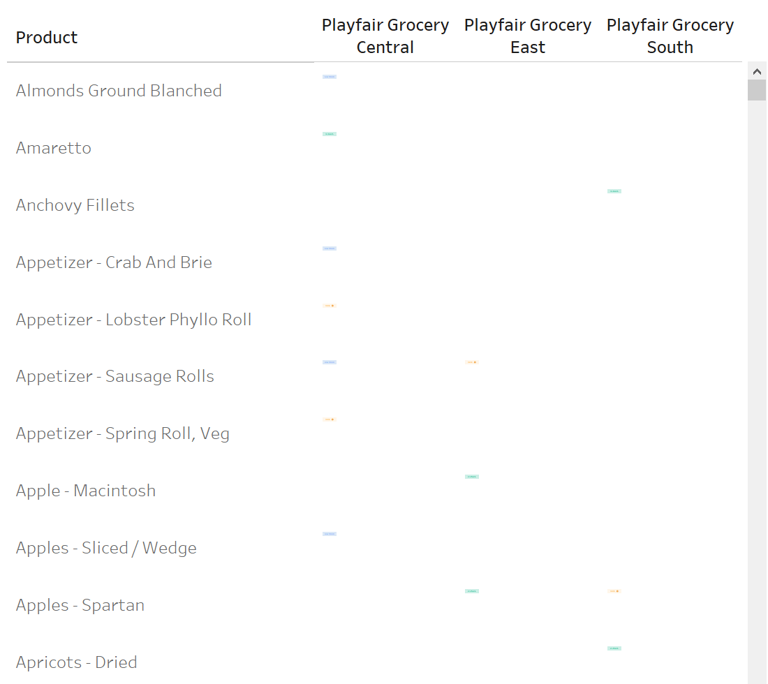 To start this visual, place Grocery Store on the Columns shelf, and Department and Product on the Rows shelf. Change the Mark type from Automatic to Shape. Drag Product Status onto the Shapes property of the Marks card.