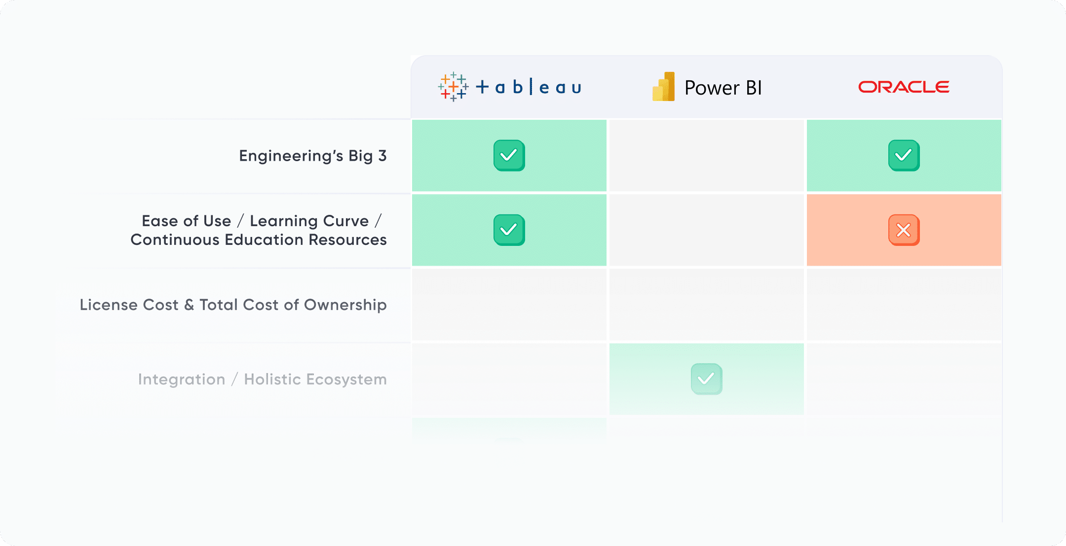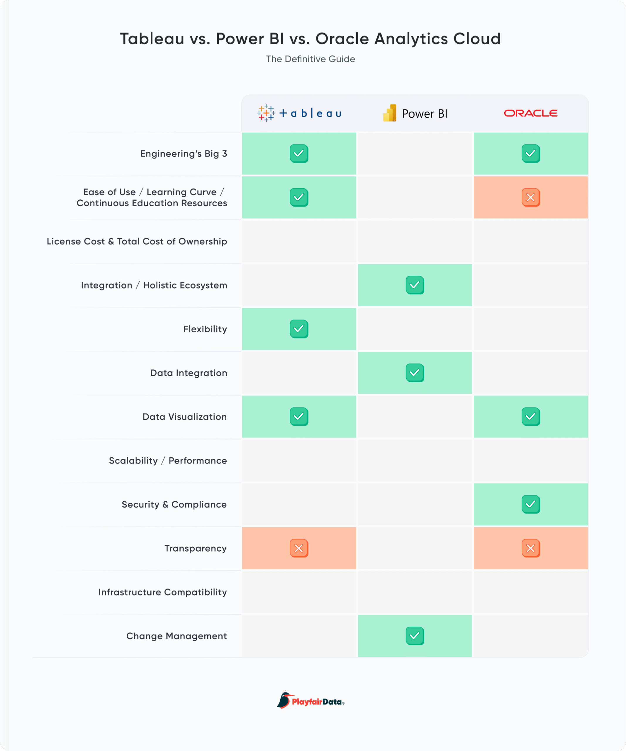 This post evaluates Tableau, Power BI, and Oracle Analytics Cloud in the context of a dozen different evaluation criteria: 1. Engineering’s Big 3, 2. Ease of Use / Learning Curve / Continuous Education Resources, 3. License Cost and Total Cost of Ownership, 4. Integration / Holistic Ecosystem, 5. Flexibility, 6. Data Integration, 7. Data Visualization, 8. Scalability / Performance, 9. Security and Compliance, 10. Transparency, 11. Infrastructure Compatibility, and 12. Change Management. Along the way, I’ll share several simple, straightforward visuals that can be copied into emails or PowerPoint presentations as you consider which option is best for your own requirements.