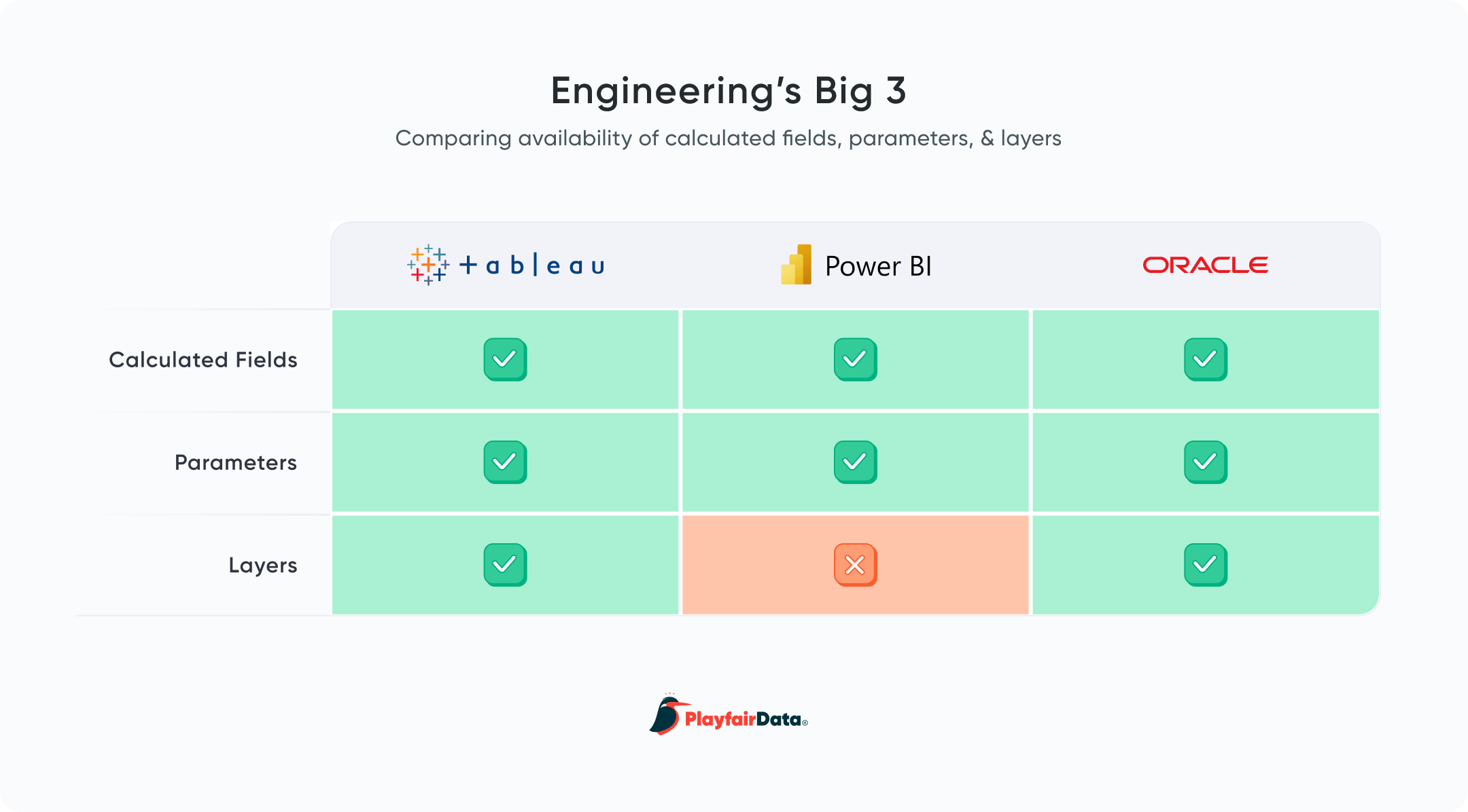The first ‘North Star’ that you won’t find in other Tableau vs. Power BI vs. OAC comparisons is Engineering’s Big 3. I know you won’t find them elsewhere because it’s something I came up with myself over a decade ago. Engineering’s Big 3 are the three technical features that I believe unlock the most flexibility in a BI tool and are critical to the success of the engineering phase of the Playfair Venn (Strategy, Data Prep, Design, and Engineering). I may also argue that the engineering phase is the most important role within visual analytics for a BI software to serve as it’s this step that ultimately combines the strategy, data preparation, and design together to bring interactive analytics tools to life.