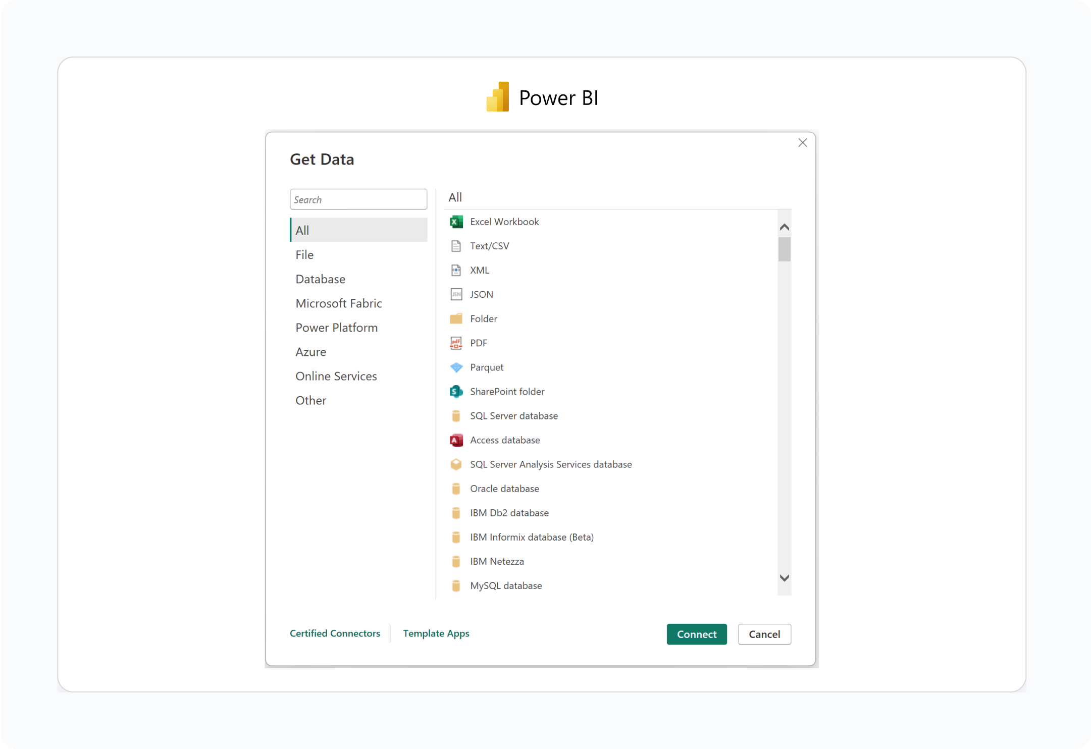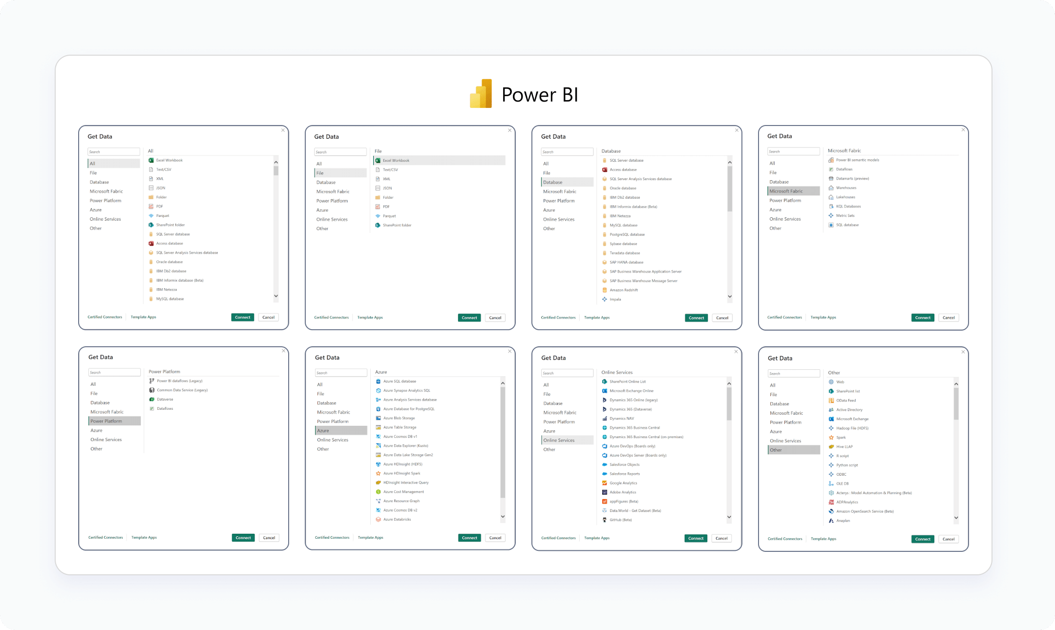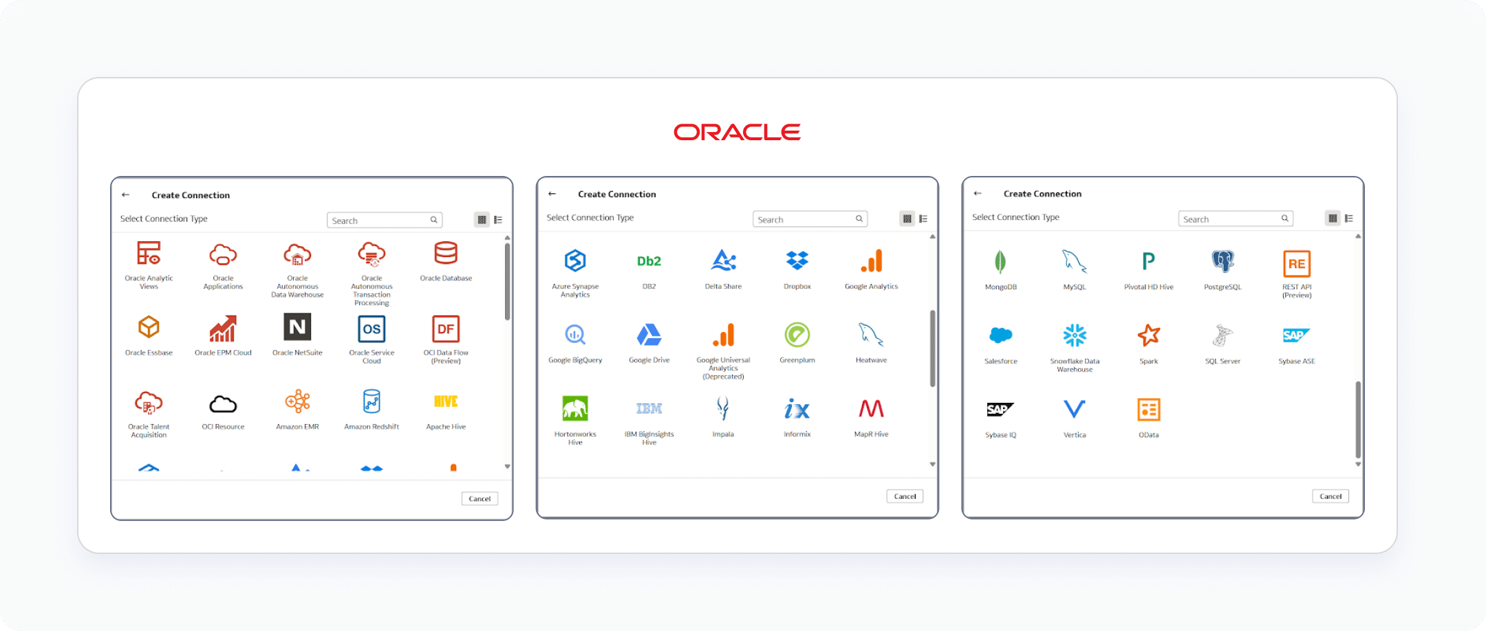 These three leading BI programs categorize their vast data connections in different ways, but as of this writing, Power BI leads the way with 204 possible data connections, Tableau has 126, and OAC comes in with 55. There is some nuance to this count with some data connections being grouped and having subcategories (i.e. “Text file” may allow you to connect to .txt or .csv files), but these counts are directionally accurate. For this section, it will be best to show you the connection options or let you explore the respective Knowledge Bases of Power BI, Tableau, and Oracle so you can confirm they offer the data connections you need.