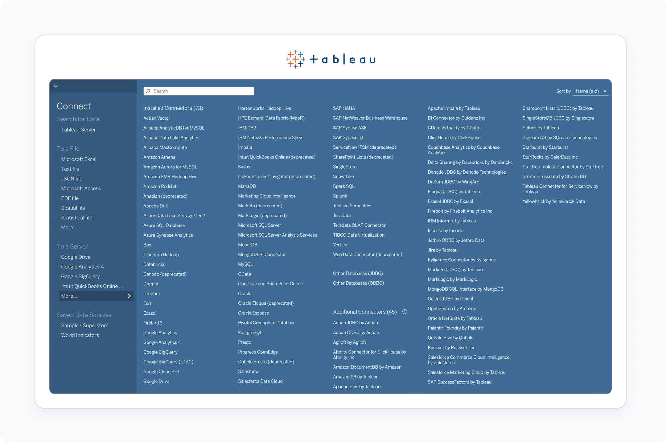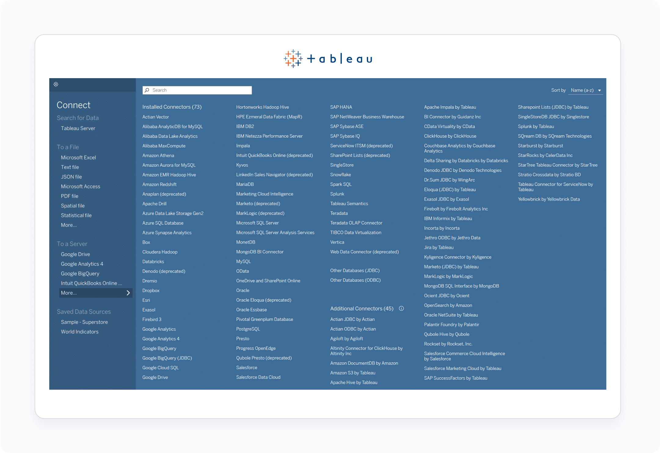 While the ability to write custom calculations and use conditional logic makes it relatively flexible to achieve your analysis objectives within all three tools, I’m going to give Tableau another nod here for three reasons. First, and as discussed in the Integration section above, Tableau is the only one of the three designed from the start to be flexible enough to connect to any data source, regardless of whether it’s part of the BI tool’s larger brand umbrella. In addition to the 70+ possible connections discussed in the Data Integration section below, Tableau also lets you connect to other databases (i.e. ODBC, JDBC) or custom web connectors.