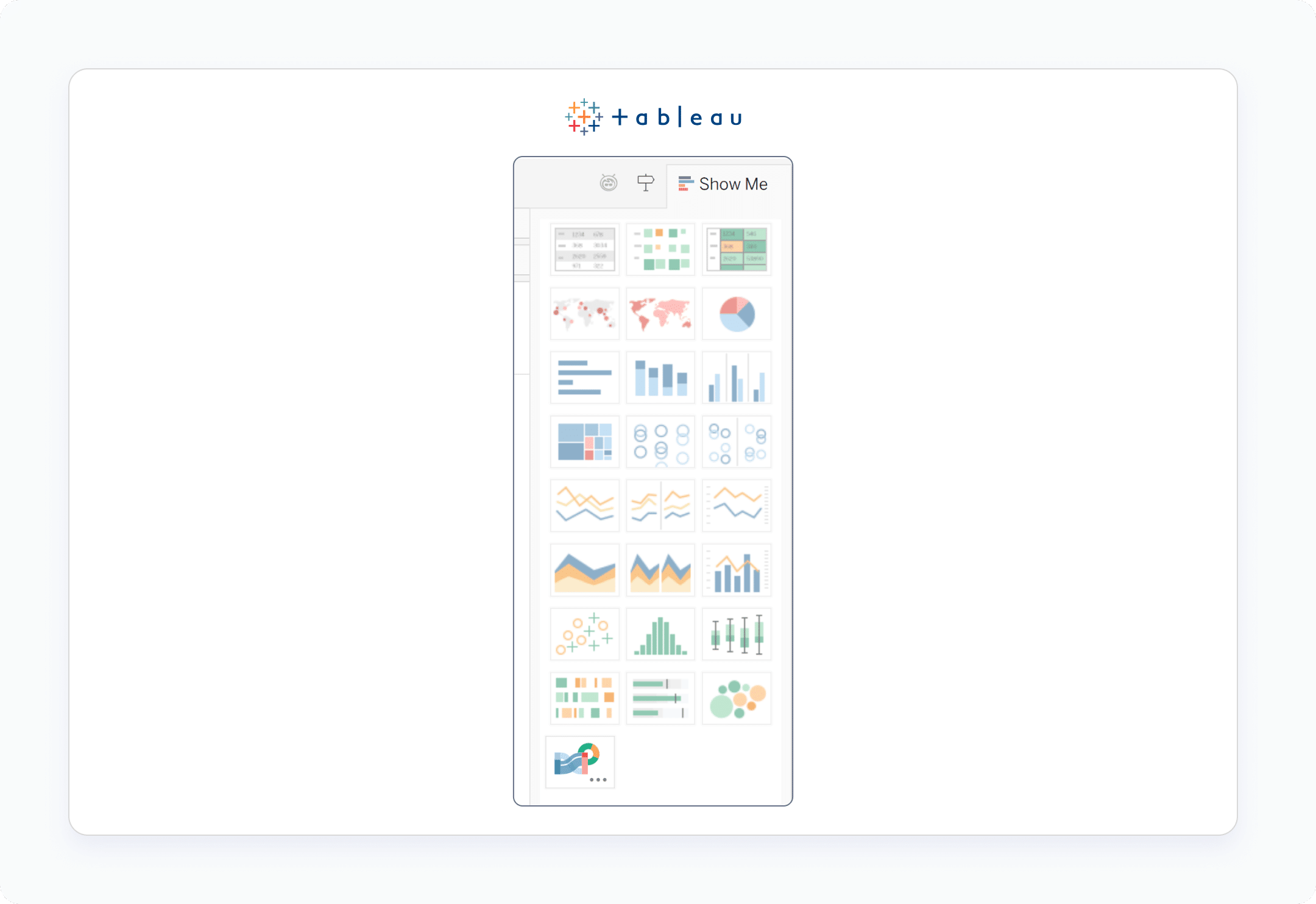 As all three tools provide enough data visualizations to meet most business needs, including what I describe as “the staples” of bar chart, line graph, and scatter plot, this portion of the evaluation will be based on the quantity of predefined data visualizations available in each and their respective data visualization aesthetics / formatting options. As of this post, Tableau has twenty-four possible data visualizations within their Show Me functionality. In late 2024, they also introduced a native option to tap into additional char types using an extension functionality.