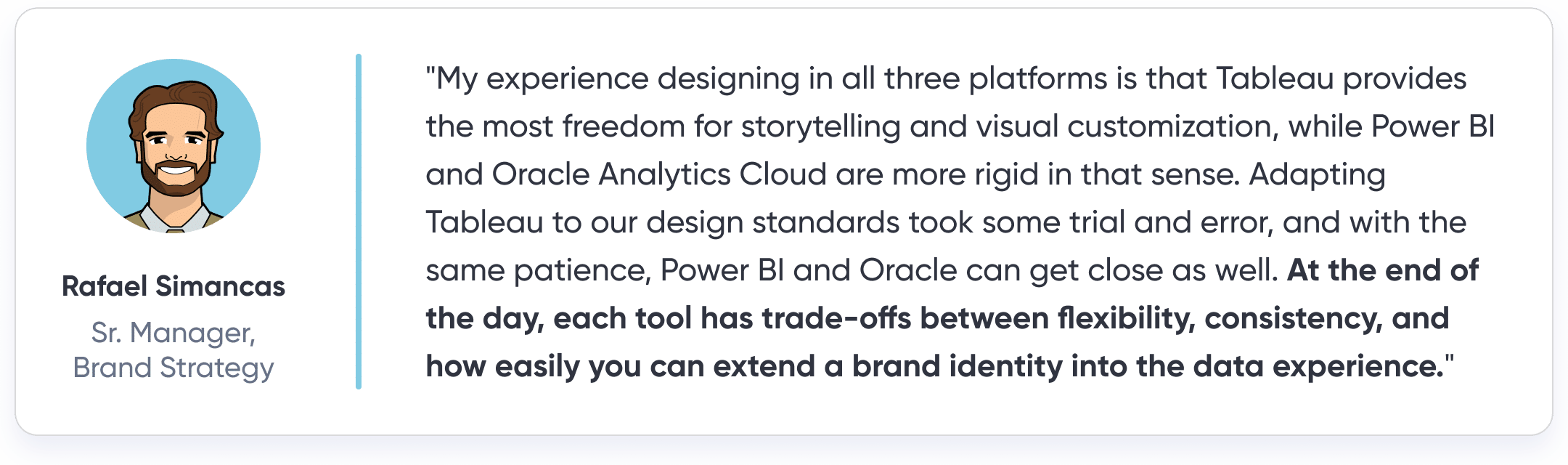I wrote a post over ten years ago about Tableau’s flexibility, before OAC even existed, so they have another first-movers’ advantage in this category. That’s why I also want to be clear that the other tools have caught up significantly in this area, whether it’s Power BI introducing parameters or OAC mimicking some of the best user experiences in Tableau. Nevertheless, these are not enough to match the flexibility that the combination of Tableau’s connectivity, proprietary VizQL language, and native designer-focused features provides.