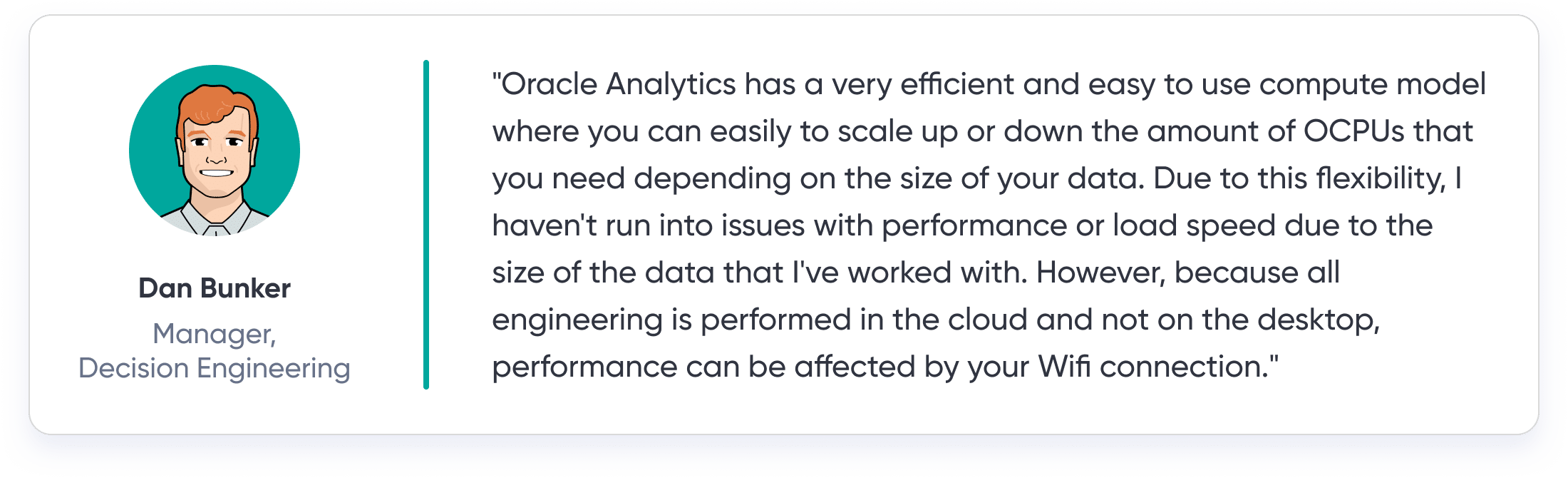 Some of the discussion about infrastructure compatibility should center around the points that have already been covered in the Data Integration section above. In addition to those considerations, and generally speaking, Power BI and OAC are going to work more seamlessly when integrated within an existing Microsoft or Oracle environment, respectively. Tableau is the only one of the three that was designed from the beginning to complement any technology stack, which may be a pro or con depending on the variety and scope of software already embedded at your company.