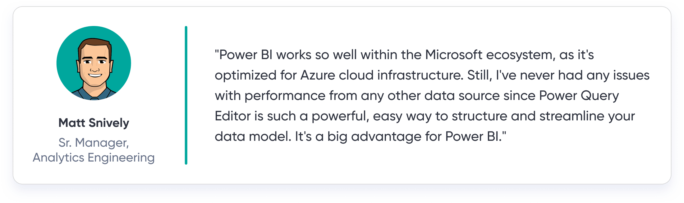 The reality of this category is also that many factors contribute to the performance of all three tools including, but not limited to, the power of the hardware being used, size of the data being analyzed, complexity of calculations that need to be executed, number of people competing for the same resources, type of data being queried, etc., etc., etc.. Since Tableau, Power BI, and Oracle Analytics Cloud all offer similar performance, and some of the factors influencing performance are outside of the control of the BI program itself, I’m not going to offer a perspective on this criterion. Instead, here are some experiences with each tool from our engineers.