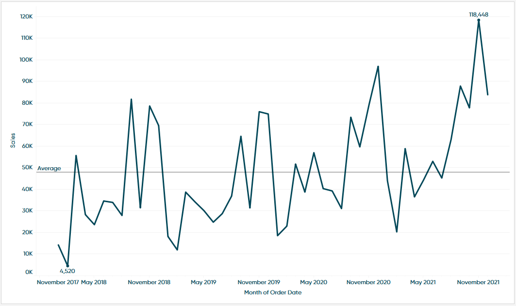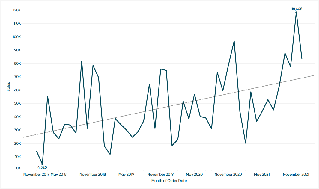 For this tutorial I have created a line chart of Sales by Month of Order Date. This gives me the ability to preview each option with you in detail.