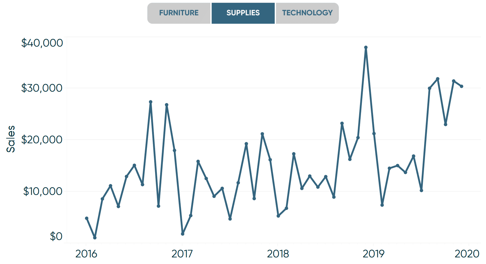 Everything else works the same way as the first approach. The parameter action controls the current value of the Toggle Choice parameter, which both colors the toggle and filters the line graph. Here’s the dashboard after selecting Furniture again.