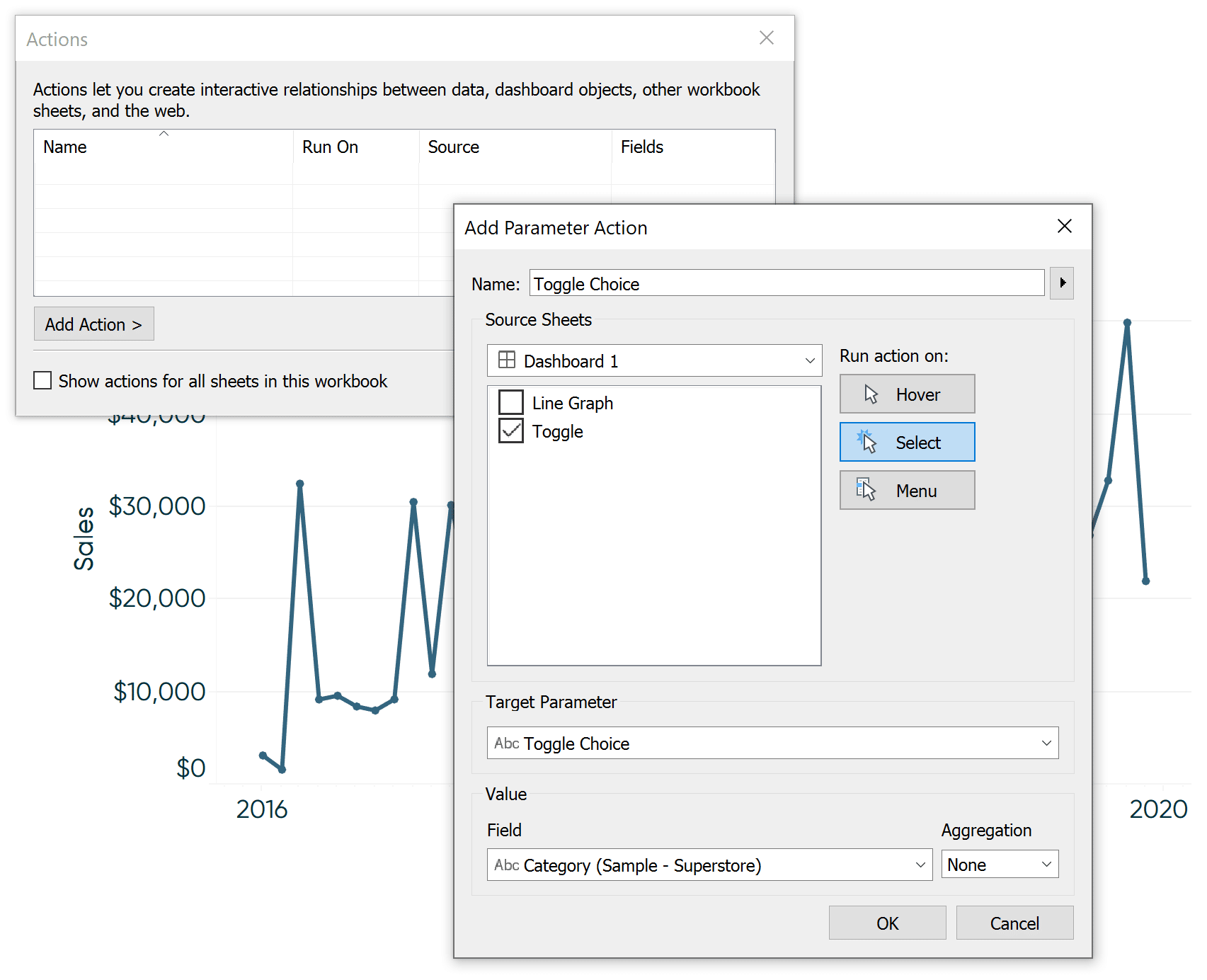 Lastly, set up a parameter action that passes the value of the dimension member from your control sheet to the Toggle Choice parameter.